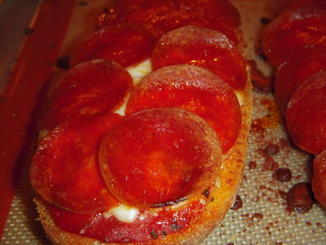 The recipe for a french bread pizza is pretty straightforward. Preheat the oven to 400F. After it reaches temperature wait about 10 minutes for the oven temp to even out. In the mean time while the oven is preheating, lets make up the pizzas. Take the baguettes and slice in half lengthwise, just like you would make a sandwich. Place the cut halves onto a lined jelly roll pan. Top with the usual toppings (pizza sauce, basil, parmesan, mozzarella, pepperoni), or with whatever crazy combo you want. Pop it in the oven for about 20 minutes until the pepperoni and