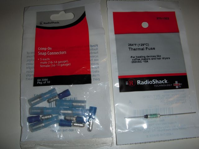 At least I was smart enough to install the replacement thermal fuse with bullet style electrical quick connects, in case it ever needed to be replaced again. This time around I going to use a slightly higher temperature thermal fuse than the first time around. So this time I’m going to go with a 291.2F (144C) thermal fuse. Since the next highest temperature thermal fuse at Radio Shack was 550F, but at that temperature, I would think that the plastic housing would start to melt before the thermal fuse would trip. Which would kind of defeat the whole purpose of having a thermal fuse to begin with.